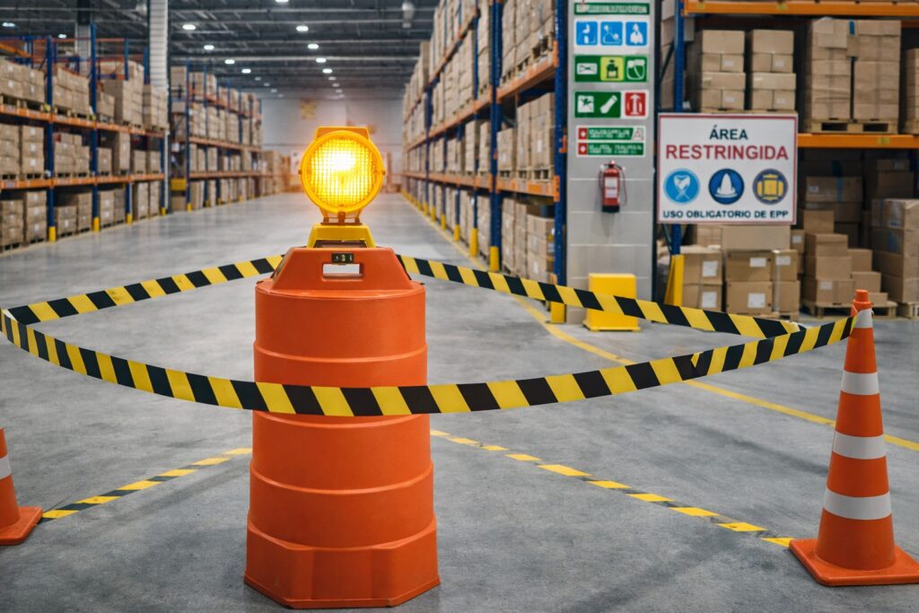 Trafitambo con luz LED de advertencia y señalización de seguridad industrial en área de almacenamiento de químicos.